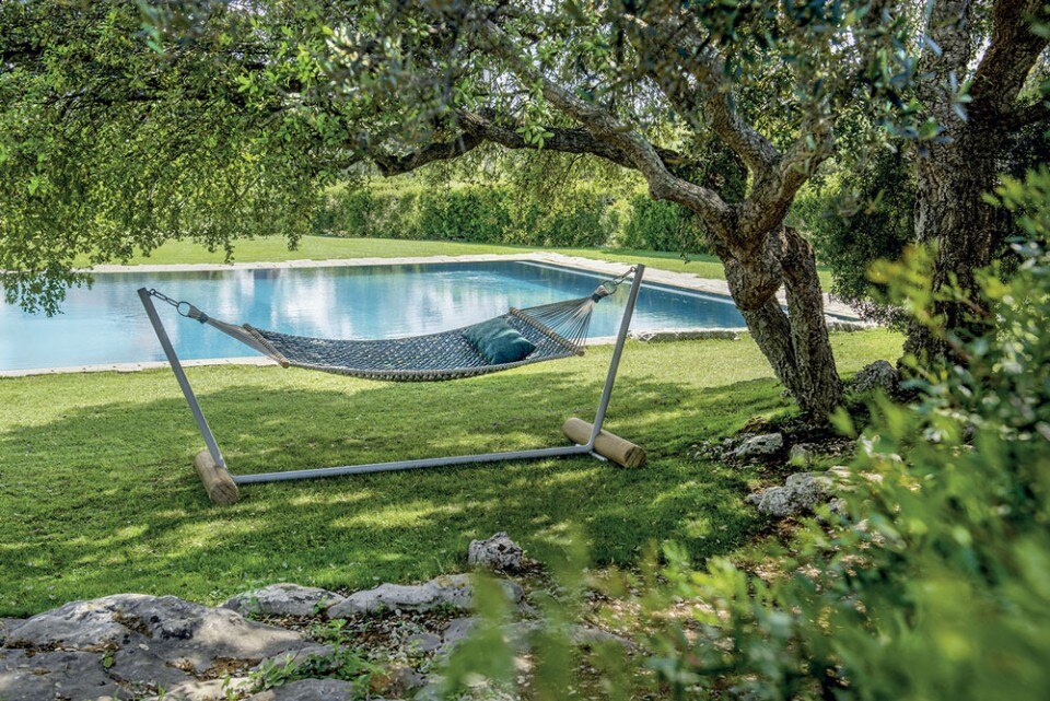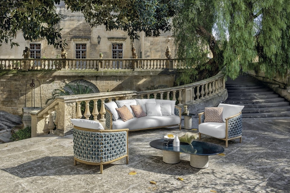 The woven pattern is built on a frame of gray rope through a new arch-shaped weave defined in shades of blue, and can be found in both lounge and dining pieces. The lounge collection includes the armchair, sofa, daybed, hammock, and coffee tables, the latter characterized by a glazed lava stone top available in two shades: mist or moss green. The cushions for the seats are large and enveloping, in tones of sand and sea, while the decorative cushions are inspired by the colors of Mediterranean flora.
