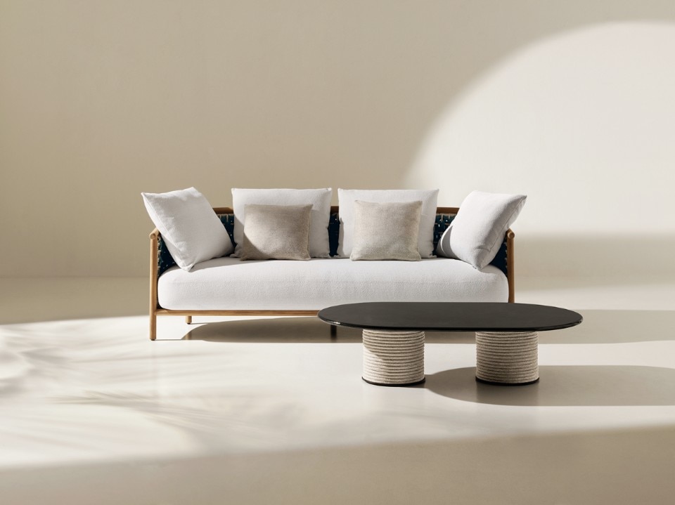 For dining, the designers envisioned two tables, one round and one oval. The tops are made of Cipollino marble and travertine in vein, and the bases are inspired by nautical ropes that wrap around the spools usually found along the docks. Made of teak, they are embraced by the blue rope that characterizes the entire collection. Completing the set are the armchairs with padded cushions that echo the arch weave of the other seating.