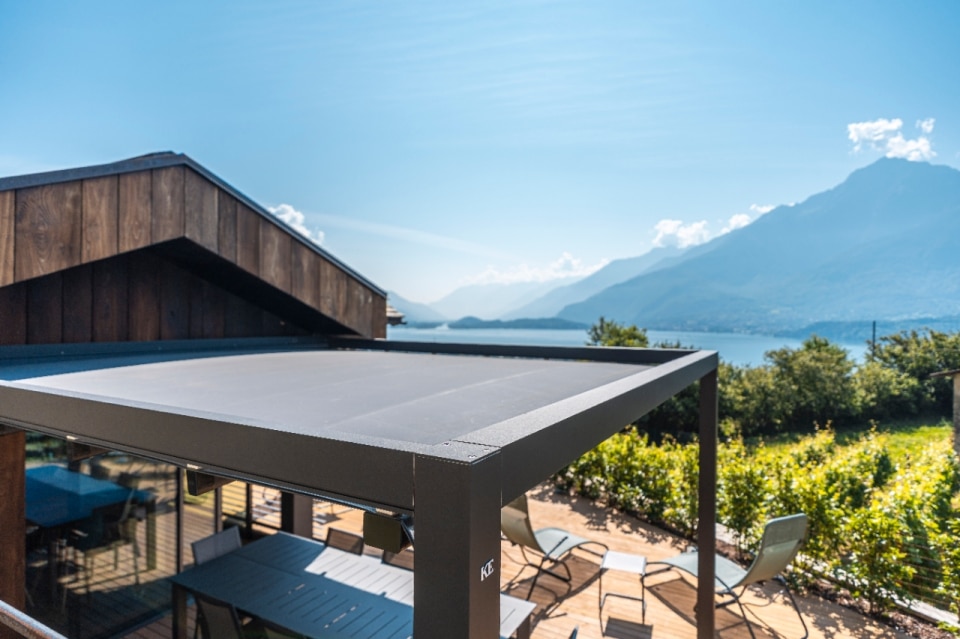 The project therefore turned to a solution with a sober, high-performance profile, capable of combining aesthetics and functionality without compromising the visual impact on the lake landscape. And this is where Keplan, the innovative flat-roof pergola by KE, comes in. Made entirely of aluminum, Keplan stands out for its essential and modular structure, designed to integrate discreetly into any contemporary architectural environment. Its clean lines break with the traditional slope of classic pergolas, proposing instead a roof with a lowered arch that improves formal balance and reduces visual clutter.