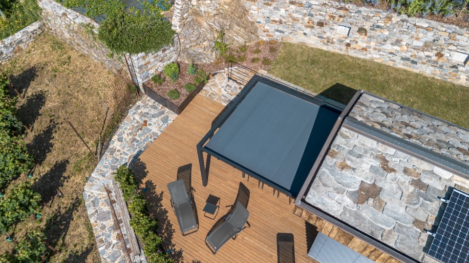The Keplan aluminum pergola, designed by KE, combines technical performance with with a minimalist profile that reduces its visual impact.