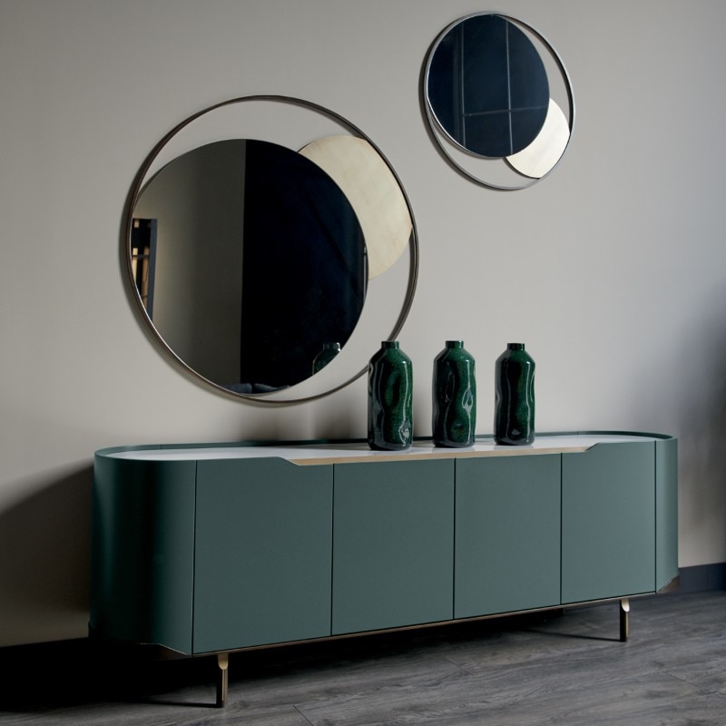 Sideboard and TV stand cabinet echo the same formal logic as the cabinet: metal legs and profiles, curved wooden sides, opening with ergonomic doors, and metal details embedded in the wood. The top can be requested in wood or stone/marble, and the interiors take advantage of glass shelves, flat and shaped, to maintain visual lightness and stylistic continuity.