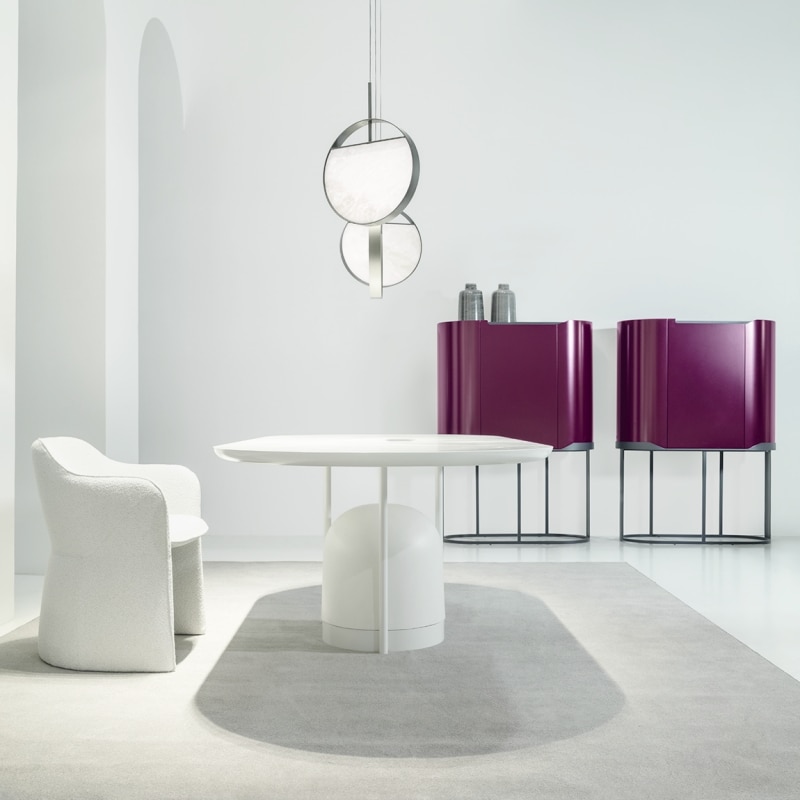 Cantori offers the Oasi Collection, designed by Maurizio Manzoni, which includes table, sofa system, cabinet, sideboard and TV cabinet. The collection is characterized by an "esse"-shaped metal profile that elegantly wraps around the curved sides of the furniture, while the metal legs are connected to the floor by a perimeter elliptical band.