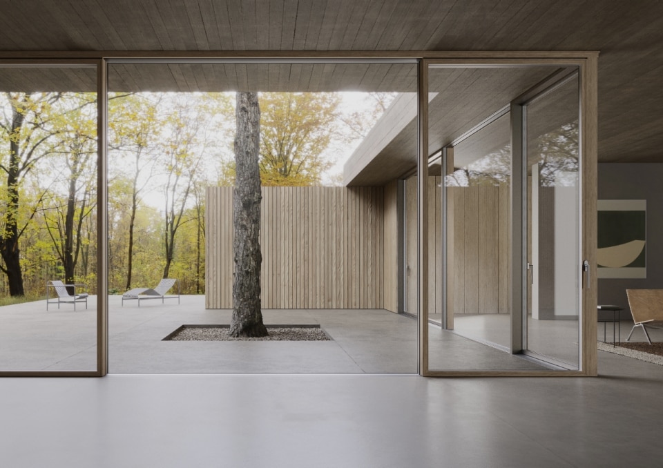 Aesthetically and functionally, the finishes were carefully selected: the exterior is aluminum with titanium finish, while internally we opted for bleached oak, which enriches the room with its visual warmth. Standard triple glazing and reduced thresholds ensure high performance in terms of thermal and acoustic insulation and living comfort.