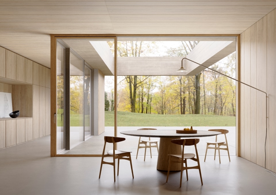 The natural setting becomes an integral part of the design in this house, where ERCO's signature large windows let in light and vegetation, creating a continuous dialogue between inside and outside.