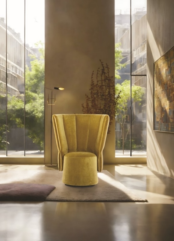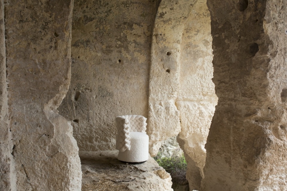 A guiding principle is comfort—not only as technical quality, but as a human value. Their furniture is designed to respond to the evolving ways of living and to people’s deepest needs, such as the desire for refuge, protection, and intimacy. Examples include the new version of Choco Magic, a modern reinterpretation of an iconic 1980s piece; the romantic Giuggiola armchair, inspired by traditional hairstyles of Matera; and the Vivì armchair, a true “silence capsule” made with sound-absorbing materials derived from industrial waste.
