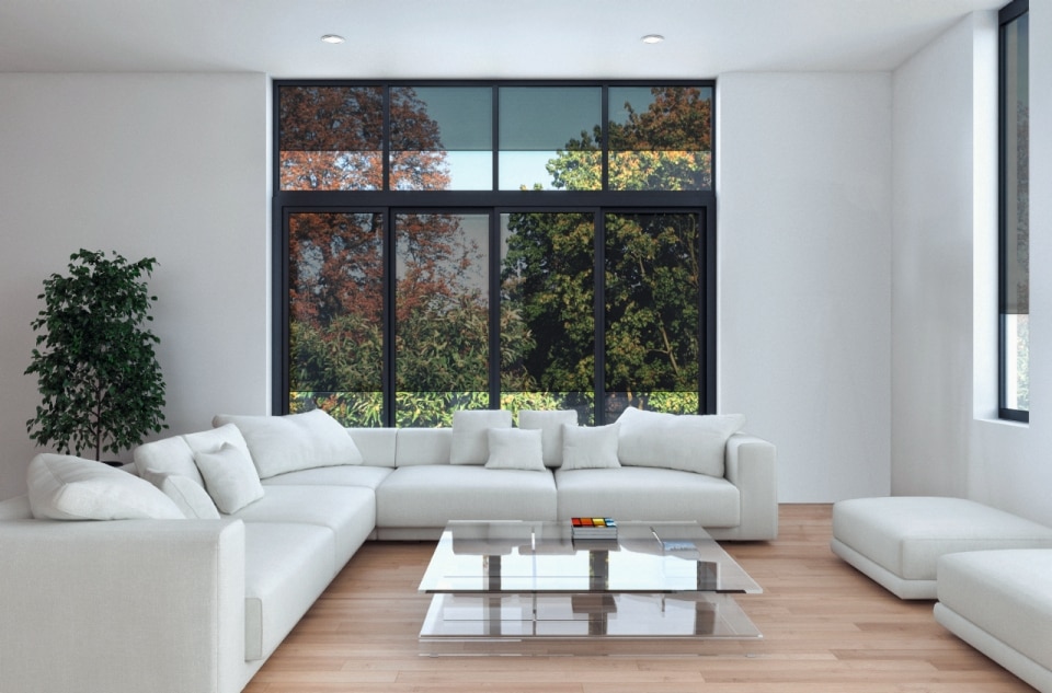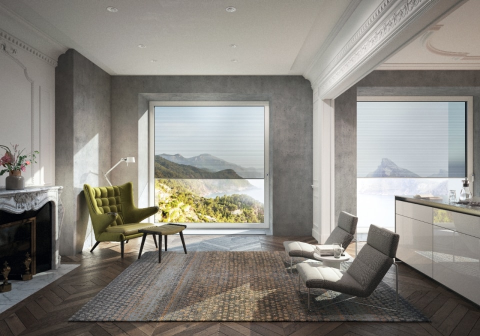Schüco's Integralmaster integrates the blind into the window frame, adjusting light and privacy with a gesture and without visual clutter.