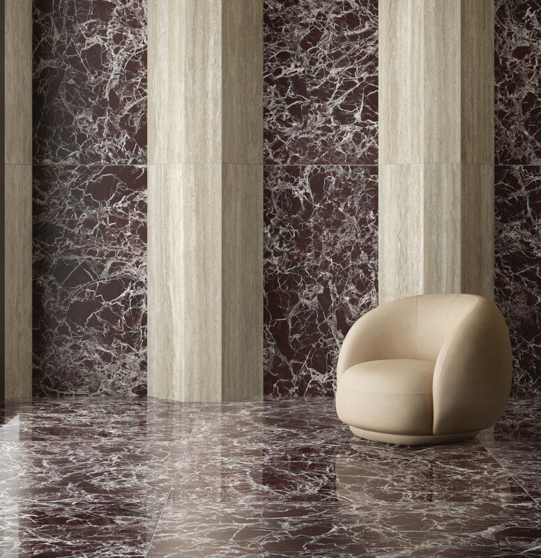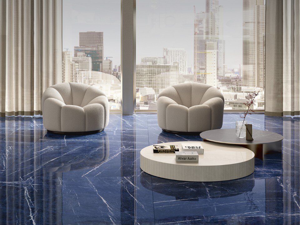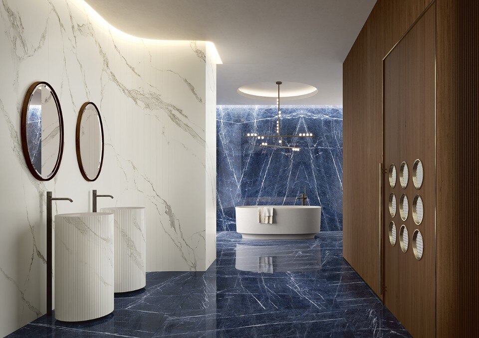 Fiandre Architectural Surfaces reimagine the qualities and splendour of these precious stones with nine new porcelain stoneware surfaces from the Marmi Maximum collection: Bardiglio Sublime, Breccia Mirabile, Calacatta Dorato, Cremo Superiore, Lepanto Rubino, Nero Damascato, Grand Carnico, Divine Blue, Majestic Onyx.