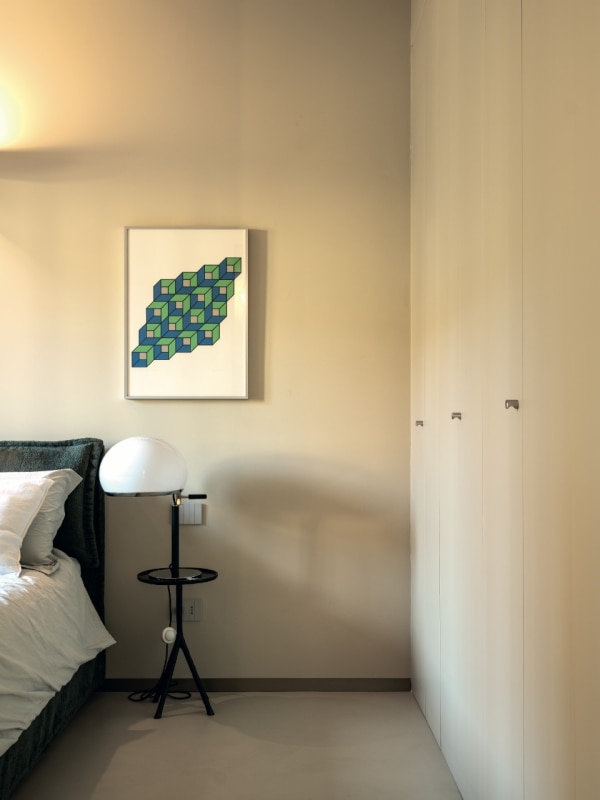 The flush doors guarantee perfect continuity between the panel and the wall, and have been designed for practical daily use, also drawing on completely invisible push-pull opening systems. The entire system has been conceived to offer a function product that also serves as a furnishing element. For example, in a refurbishing project designed for a home in Milan shown on this page, the entire wall of a bedroom is transformed into a uniform backdrop, with a sequence of flush panels free of any visible frames or jambs. The effect is that of a compact installation, devoid of visual interruptions, which conceals essential space.