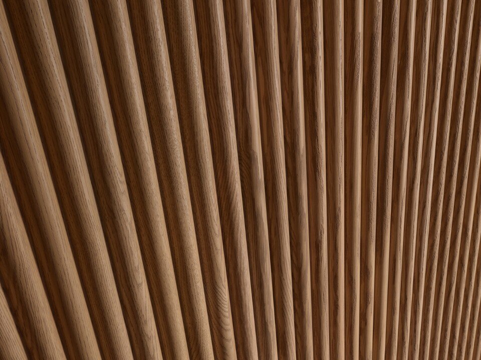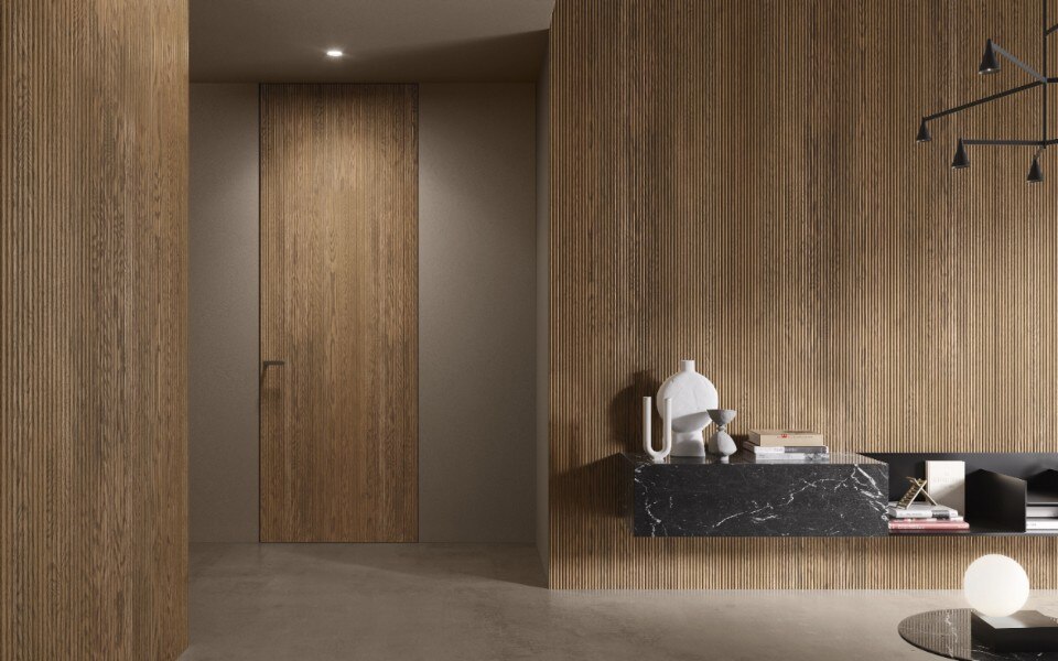 To enrich the possibilities of customisation from 2021, there are also two new solid wood panelling patterns: Quadro and Onda, characterised by solid engraved oak surfaces. These two motifs, which can also be applied to Filomuro doors, are made up of three-layer panels: 8 mm of solid pantographed American oak + 3 mm of water-repellent marine MDF + 8 mm of solid American oak for a total sandwoch of 19 mm. Solutions that allow the composition of modular panels that are easy to install.