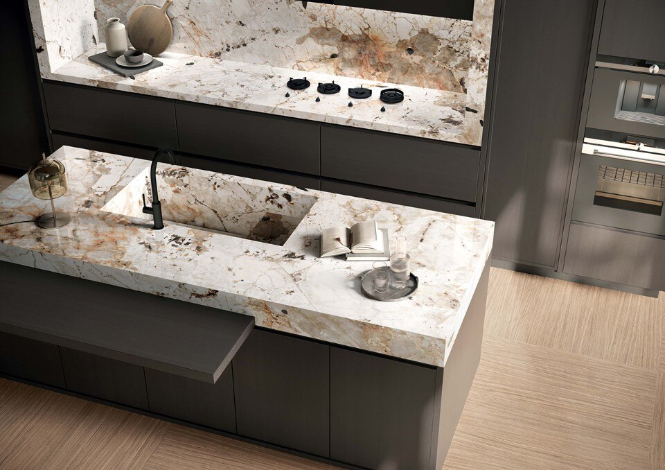 The result is the creation of elegant spaces that flow between indoors and outdoors, enhancing the presence of light to give the sensation of being immersed in the natural environment at all times. The collection's marble surfaces reinterpret some of our planet's most enchanting landscapes and natural combinations.