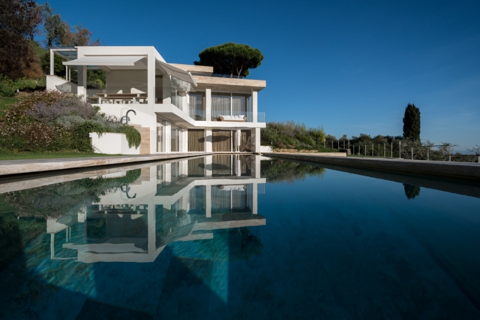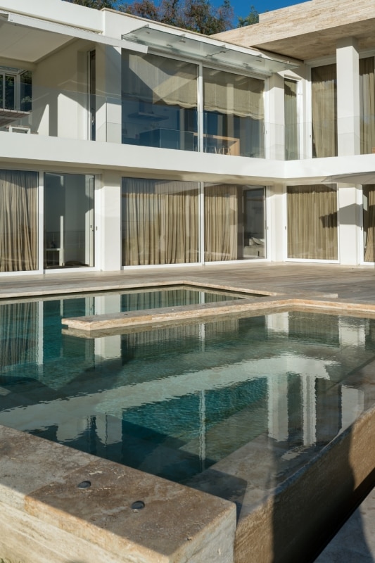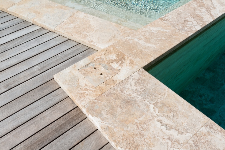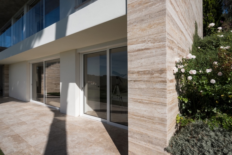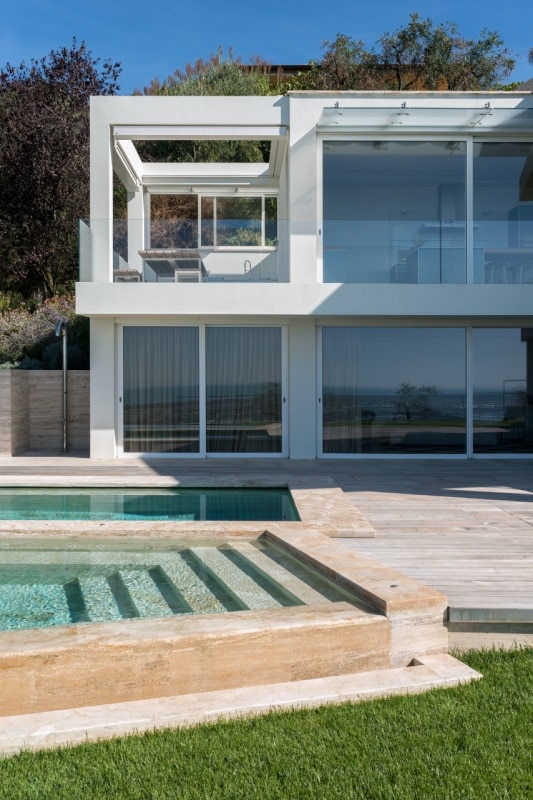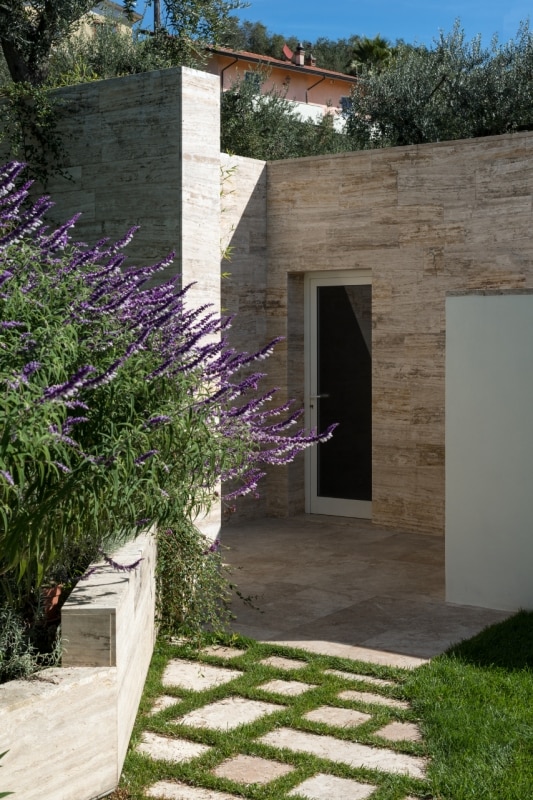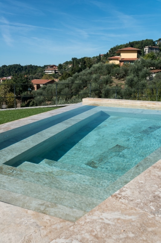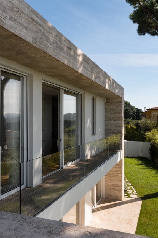In the hills of Massarosa, a fine villa designed by Vaselli Marmi enhances Becagli travertine in a contemporary design that dialogues with teak, glass and metal.