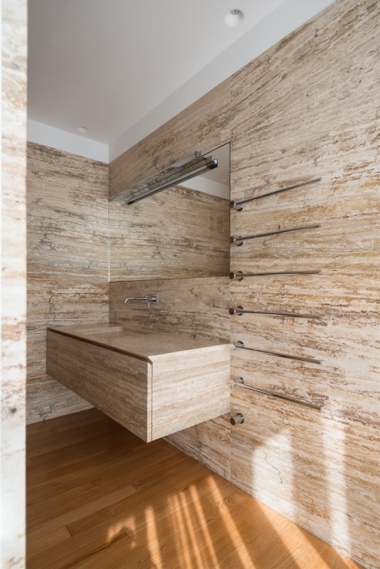 Having found the raw material, the construction of the villa, designed by Massimo Luporini, embraced its potential. Vein-cut travertine covers the facade, while cross-cut travertine has been used for the floors, giving rise to a monumental block of stone with contemporary lines that dialogues with teak, glass and metal, and blends into the green hills overlooking lake Massaciuccoli. The stone floors also lead inside, illuminating corridors and living areas through a careful selection of materials and large-scale formats. In full respect for the materials, the bathrooms have been furnished with Le Cave collection by Vaselli, with units with sides and doors in cross-cut Becagli travertine that blend in perfectly with the rest of the bathroom. With their attentive design and careful cutting, and their reconstituted slabs reflected by the cladding, the furniture seems to emerge from the wall surfaces as though they were one and the same. With a view to making the most of the splendid panorama, the design provided not only for generous windows, but also a swimming pool, again in Becagli travertine, with a relaxation area equipped with chaise lounges and whirlpool baths connected to a lane for swimming.