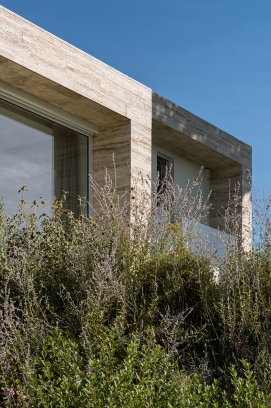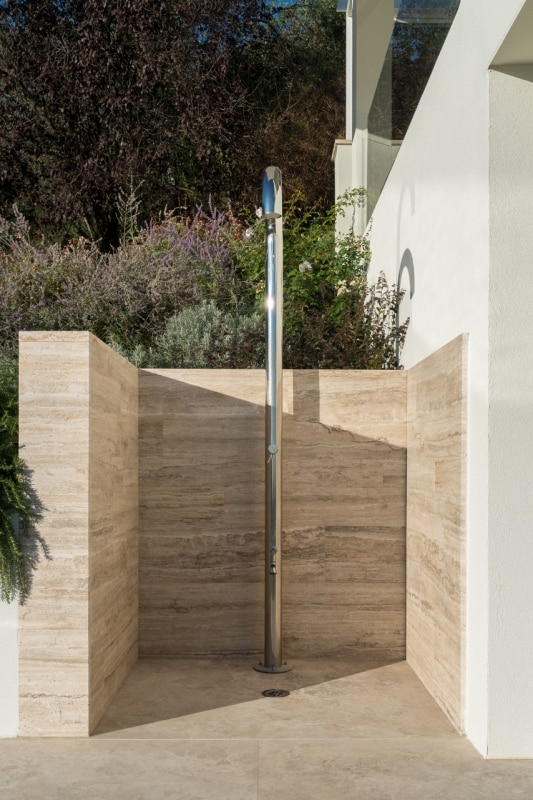 The villa in Massarosa thus stands out as an elegant jewel in travertine, taken from the quarries of Rapolano into the hills of Versilia and turned into a home where every space allows the material to speak its own natural language.