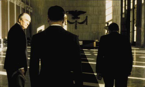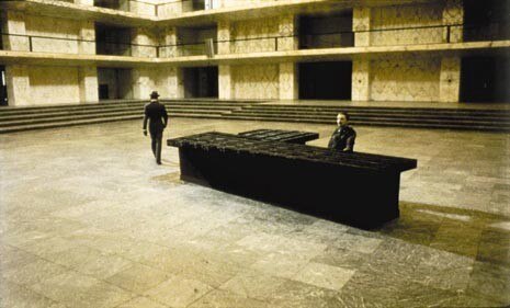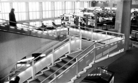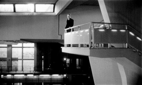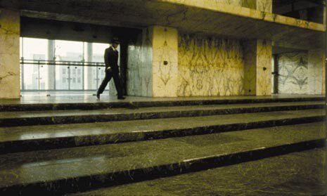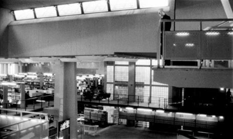 Daniel (Bruno Ganz) and Cassiel (Otto Sander) are angels who have free access to prison cells, hospital wards and library spaces, in the Staatsbibliotek by Hans Scharoun.