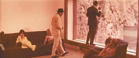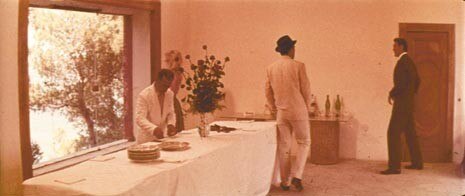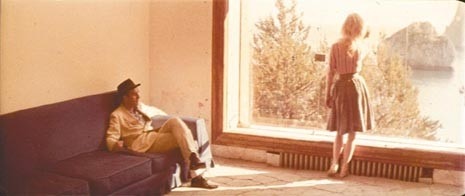 The final part of the film is set on the roof terrace and in the large living room of the Capri villa of a cinema producer (Jack Palance), the Villa Malaparte, by Adalberto Libera, who plays host to the shooting of a film about the Odyssy by the director Fritz Lang (who plays himself). Amongst the team are the screenwriter (Michel Piccoli) and his wife (Brigitte Bardot). The actors go round in a complete circle backwards and forwards along the sides of the rectangular space, stopping each time to look outside, magnetically attracted to the landscape which is framed by the large openings and the small fireplace window.