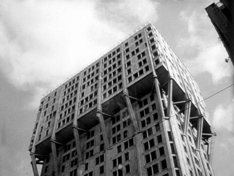Before the title sequence appears, the leading character, Alberto Nardi (Alberto Sordi) is taking a stroll with a companion in the piazza at the foot of the tower block where he lives, the Veladca Tower, by BBPR Studio, wickedly planning the elimination of his wife.