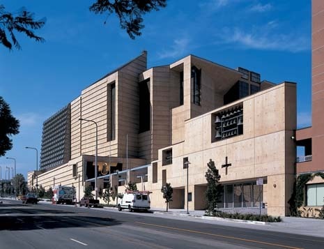 The first, modestly scaled Catholic cathedral of Los Angeles was built in the 1870s, when L.A. was a dusty farming town of 50,000 people. In 1904, as immigrants flooded in, the diocese resolved to build a new cathedral, but the decision was repeatedly postponed until the 1994 earthquake rocked Saint Vibiana’s and made it unusable. Two years later, developer Ira Yellin and architect-planner Richard Weinstein organized an international competition to select an architect. Rafael Moneo was named the winner on the same day that he came to L.A. to accept the Pritzker Prize. The archbishop of Los Angeles, Cardinal Mahony, wanted to build over the humble old structure; however, preservationists objected, and a new, more prominent site was found. The new cathedral occupies a full city block atop Bunker Hill, just west of the original settlement and City Hall.