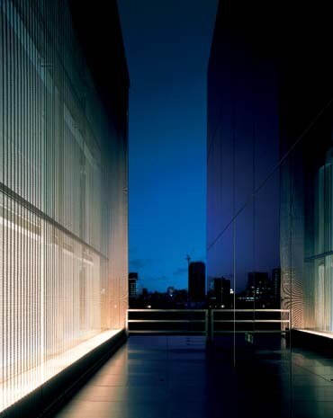 The dual skin wall system (metal weave on the outside, reflecting or glazed walls on the inside) seems to immerse them in a mist, dissolving physical substance. This is an effect made all the more theatrical by lighting placed between the two skins. The dual skin therefore serves a function: it leaves the doubt of an indistinct vision that strays into dream or mirage. In it are woven the reflections of the mirror panels turned shades of gold and pink, dematerializing the metallic effect of the steel mesh. ‘It was our intention to create a new material combining two different materials with a new spirit’, explains Aoki. ‘To do this, we designed four types of metal mesh with different weaves in detail. What we came up with was moiré. When two intricate patterns overlap, a third emerges. The third pattern has non-substance. It can be seen but isn’t there’. The different weaves of the metal fabric combined with the three types of rear panel (glass, steel polished to a mirror shine and gilded steel) made it possible to adopt nine different combinations to modulate visual effect and control variations in the composition. ‘The perception changes depending on the point from which the building is viewed – from below, “squashed”, from the bottom or from the other side of the street’