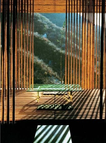 Kengo Kuma’s Bamboo Wall is a strong architectural statement that reconciles Chinese building tradition and Japanese configuration with a neo-Miesian sense of space. Placed on a narrow ledge, the design reflects the contextual linearity of the Great Wall with a single-aspect structure that embraces and celebrates the exceptional views to the west. Kuma’s ambition is to make the ‘delicacy of the building conform to the intrinsic delicacy of the landscape’, hence his choice of bamboo as an appropriate construction material (inspired by Chinese bamboo scaffolding) to adjust the level of delicacy. The ‘wall’ is shrouded in a thinly spaced frame of bamboo poles placed around the facade and on the ceilings, filtering the light through its grain and rich colour, which contrasts with the dark-grey stone floor. Modelled on the traditional Japanese engawa, the west-facing open courtyard, with bamboo screens suspended over water, is the contemplative centre of the house that successfully establishes a dialogue between the inside and the outside, between the natural and the artificial.