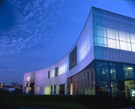 The curved facades are clad in a special semi-translucent polycarbonate which changes colour as the sunlight changes – from yellow to turquoise to magenta, colours chosen by the artist Michael Craig-Martin who worked in close collaboration with the Swiss architects.