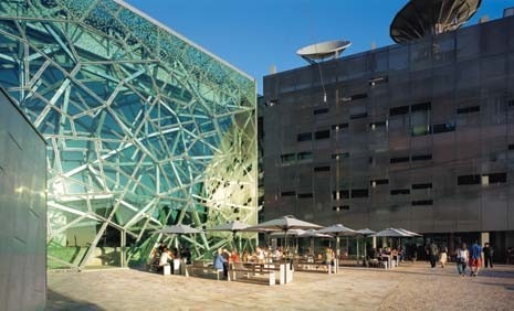 The project for Federation Square demanded the design of a new civic square for Melbourne, capable of accommodating up to 15,000 people in an open-air amphitheatre, with cultural and commercial buildings as part of the precinct. The cultural and commercial facilities combine to provide nearly 55,000 square metres. They include new galleries for the National Gallery of Victoria and the Australian Centre for the Moving Image; offices, studios and galleries for Cinemedia (a state cultural organization promoting film, television and new media) and the Melbourne facilities of SBS radio and television; numerous restaurants and cafés; and a store for books and music. All of this exists on a site of 3.6 hectares, the equivalent to a new city block for Melbourne. The civic plaza of Federation Square has been programmed to provide the new civic heart for Melbourne. The plaza, and Federation Square in general, has been developed as the locus and orientation point for Melbourne residents and for regional and international visitors alike.