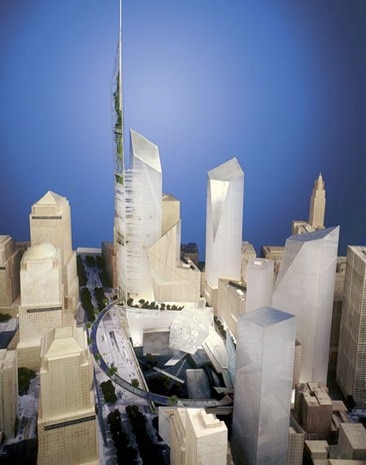 The project consists of a tower 541,32 metres high – a symbolic height, 1766 feet, a number which corresponds to the year of independence of the US – and a complex of corner buildings. The losing project in the final was the “World Cultural Center” by the team Think Design, lead by Rafael Viñoly: two towers made from a metal grid structure, just over 550 metres high.