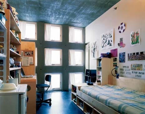 In Holl’s hands, the dormitory is no longer simply a place to sleep. It is a place that offers a fully fledged social programme of activity – a social condenser in the true sense of the term. Holl has provided for a full range of social activities: communal eating, restaurant facilities that connect directly with the street and a series of common rooms distinguished by unique light chimneys that burrow down through the different layers of the building to bring daylight into the heart of the structure. There is a 125-seat theatre and associated sports facilities arranged outside in tandem with Dan Graham’s art installation, Yin and Yang, which in a way mirrors the building.