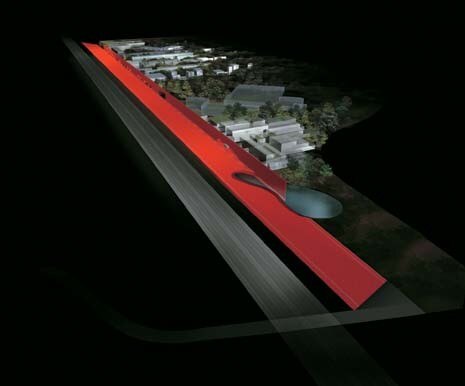 A long bright red ribbon running alongside the Milan-Venice motorway which cannot fail to be noticed and which will serve to hide the green area behind it as well as holding the necessary services for the buildings in the park: a lightweight reflective glass structure to hold laboratories, education centres, studios and research facilities (172 000 square metres). Above the wall an evocative view of the ancient upper part of the city can be seen.