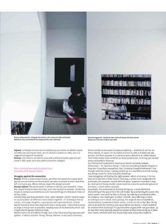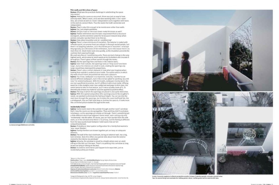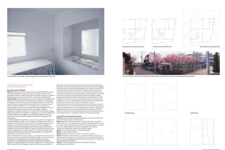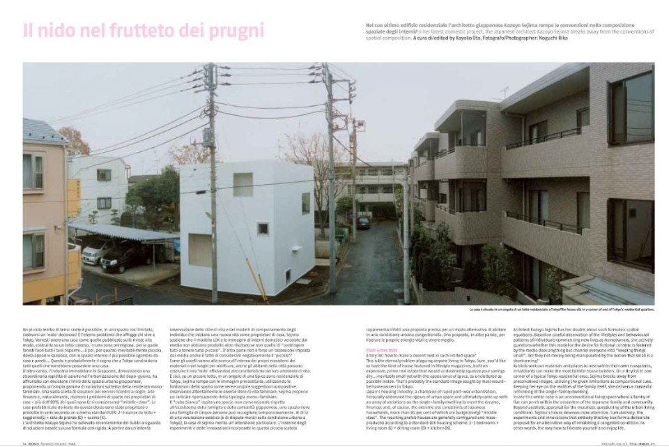 In the context, so legendary as to be almost proverbial, of Tokyo’s residential fabric, in the late 1990s a copywriter commissioned Kazuyo Sejima – co-founder of SANAA, a living symbol of contemporary Japanese architecture, and curator of the Venice Biennale in 2010 – leaving an initial carte blanche, with only the observation that she did not really want a comfortable home, she’d rather think of a place from which to leave at some point, where to constantly come and go. She recounted these initial moves to Domus, which published them in January 2004, on issue 866. And this conversation was followed by more words, exchanged with Sejima herself, and by pictures of the house, inhabited, taken by Noguchi Rika, and by Junya Ishigami, who in the years that followed would have a way of making a name for himself in the world of architecture. It is a house that goes took the place of a plum grove, and for that reason it wanted to preserve some of the existing trees; a house that aimed to make the interior a sequence of minimal spaces, redefining the relationship of the inhabitants with objects, and with their fellow human beings: a project that soon took on the value of a manifesto for domestic living.