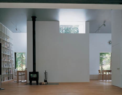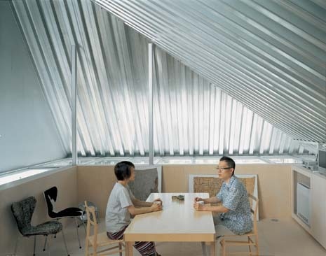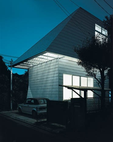 Gae House (2003) is a small Tokyo dwelling that reflects the lifestyle of the writer client who saw no need to fulfill all his needs domestically, opting instead to meet with business contacts at a nearby cafe or go fact finding at the local library. Thus, this three-storey house consists of a brown plywood bookshelf-lined half-basement workroom and galvanised steel sheeted top-floor kitchen connected by an undefined white, almost double-storey space in between. Architecturally, the discrepancy between the oversized roof and the small “box” underneath is curious, but the glass panels which line the underside of the eaves — forming a kind of transparent ledge — let in filtred light along with a sense of the outside world, while the undereaves space is partitioned into a carport by means of a hedge, like the hedges that once were everywhere in the vicinity.