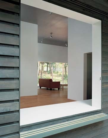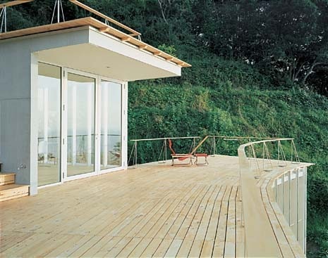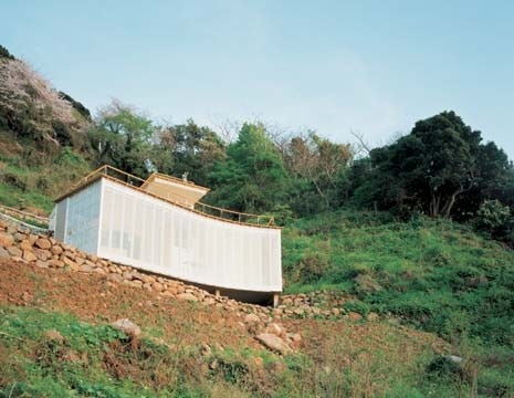 Izu House (2004) is located not in the city but on a slope with a magnificent sea vista on the Izu Peninsula southwest of Tokyo. Not wanting to merely passively view nature, the client asked that the house be situated so as to actively engage the surroundings. Their solution was a terrace that juts out over the sea, bedrooms that descend the slope by steps and a studio aligned with the contours of the land.