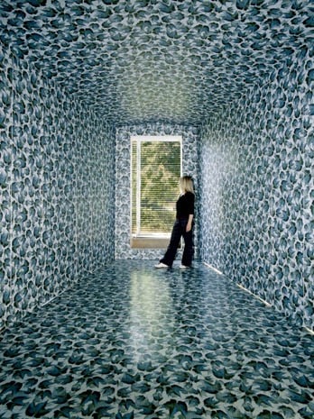 Although not the “machine for living in” with its aura of perfectionism, it is a simple, manually operable apparatus, incorporating low tech instead of high tech. Somehow these apartments are reminiscent of those hybrid appliances from the postwar reconstruction period when a kitchen sink could be extended into a bathtub in a split second. The radical reductionism is here shaped into a culture of economy that never comes across as impoverished. Rather, it is filled with good cheer. Thus the staircase becomes a virtual exterior room, wallpapered with photorealistic vine-leaf patterns that leave the spatial impression of an LSD-trip on the retina.