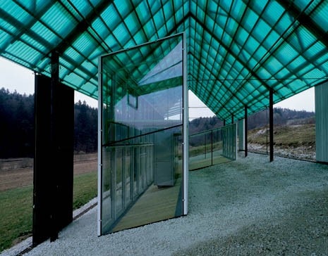 SPLITTERWERK have also approached their latest project with a great deal of wit and irony. Once again, true to their amphibian house-building philosophy, they have named it after a tree frog, this time a green one. It is a weekend cottage without any claim to permanence. In this project, they have taken literally the dictum, borrowed from the world of modernism, that a landscape should flow under, or indeed sometimes through, the building. In doing so, they have revealed it to be no more than empty rhetoric, for this building shows what it means to “have the slope flow through the building”. The architects have found the concise formula for this phenomenon: from the “house on the hillside” to the “hillside in the house” approach. Above a green area measuring approximately 10 by 25 metres, twelve round steel columns support an airy structure, which, if interpreted as a pitched roof, would slope at an angle of 45 degrees. This two-layered airy structure consists of an upper and a lower skin of green translucent corrugated polyester. The two skins are merged into a single line at the eaves and gable ends (there are no actual gables).