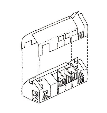 To create smoother surfaces where the volume is cut away, the architects used tongue and groove boarding. At the gable ends, horizontal larch batons across windows screen the interior from direct sunlight, and also help to maintain the impression of a solid wooden envelope. Inside on the first floor, rectangular ceiling openings serve as both skylights and escape routes for rising air.