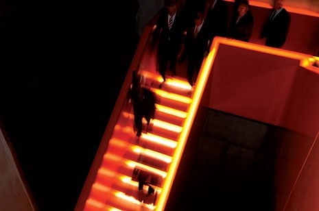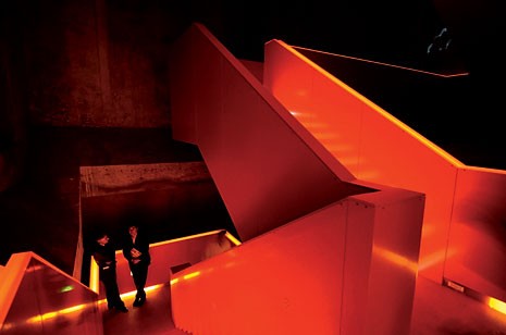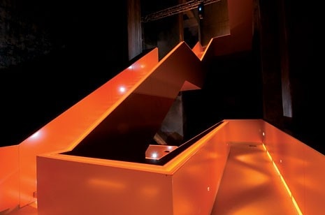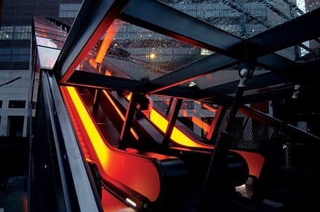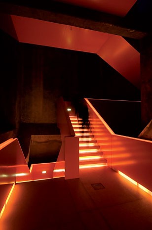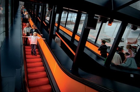 Being the most visible sign of the building’s conversion, OMA strove to make the escalator a clearly identifiable symbol of its new use. Using technology developed with Kruppe and previously employed in Seattle Public Library, it was decided to colour the treads and sidepanels orange; the result, especially at night-time, is reminiscent of a river of molten steel. With a span of 24 metres, it is the longest free-standing escalator in Europe. The interior staircase is fabricated in unpainted steel; the illusion that it is coloured bright orange is created by the tinted strip lights set into the side-panels.