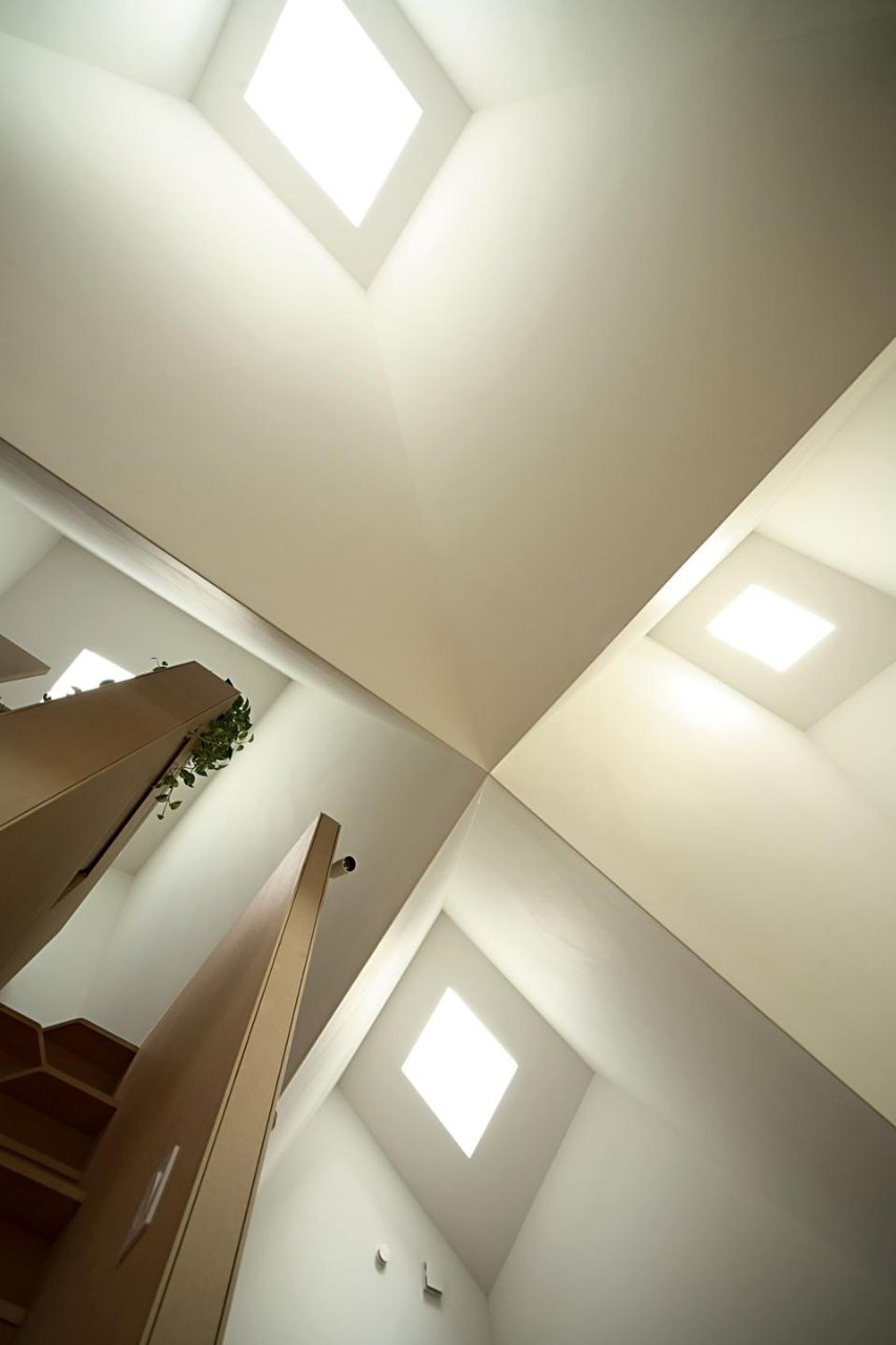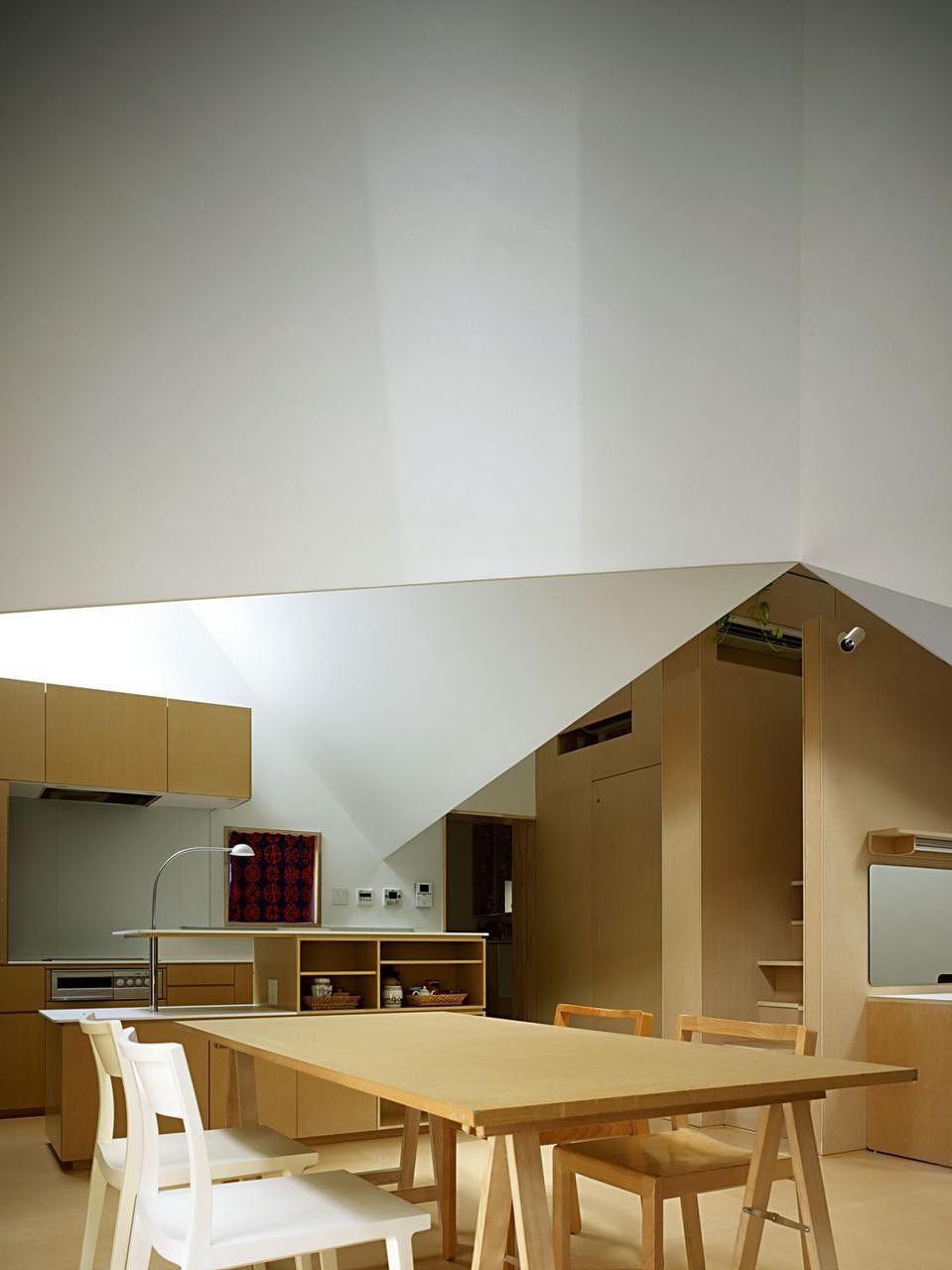 The ceiling modulation determined the division of the interior, conceived as a single continuous space that expands and contracts along fold lines running at different heights. So, all over the house the individual family members can perceive the others’ presence despite being visually separated.