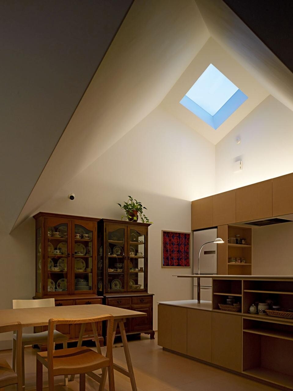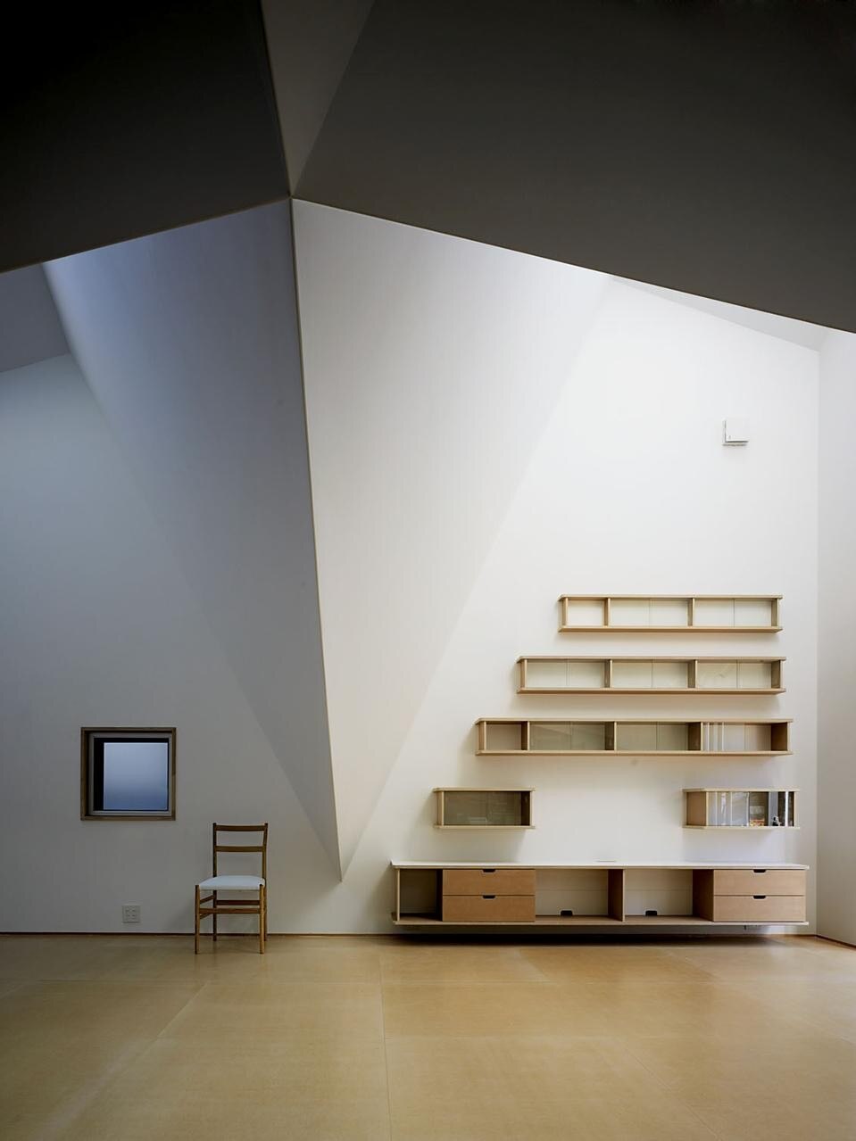 The roof fold lines mark the internal layout but it is the internal walls and ceilings, like light chutes, that flood the space with the colours and hues of the changing hours of the day and seasons, recording the passage of time and changing nature. The roof openings also frame patches of sky, creating a space that is removed from its context and projected elsewhere in a rarefied and suspended dimension.