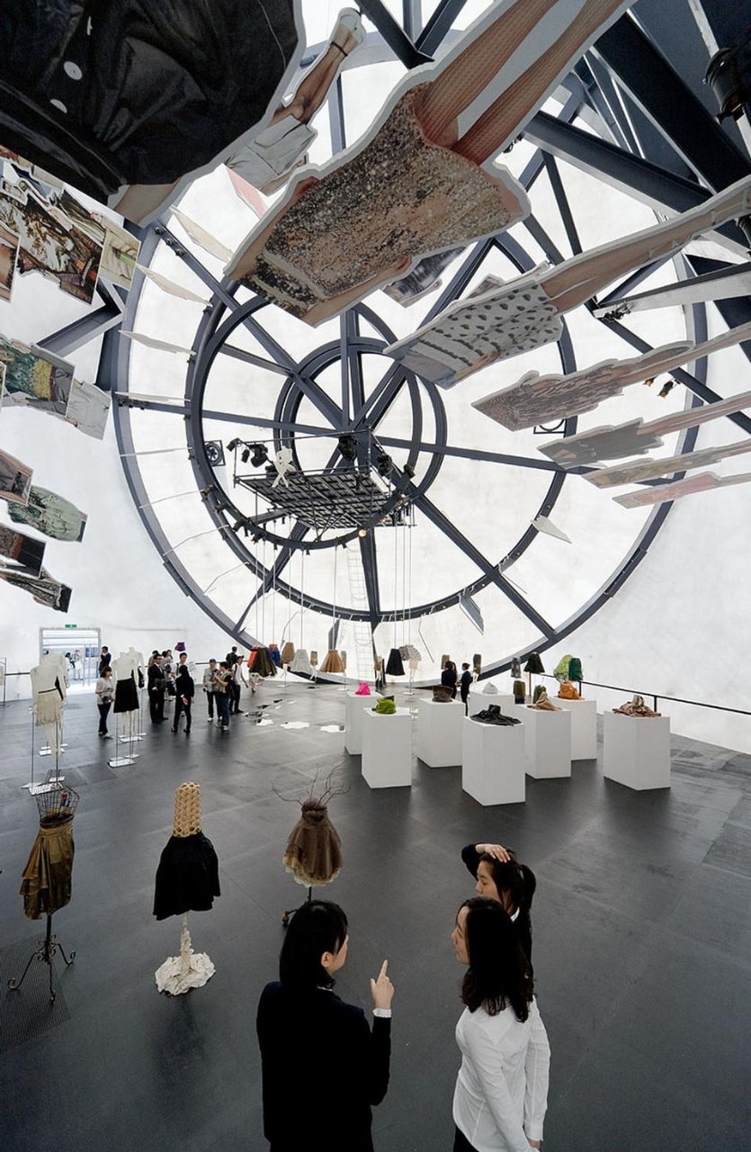 In order to accommodate a range of different fashion, art and movie events in 2009, cranes rotate, and then flip the pavilion into 4 different façade and floor plate configurations.