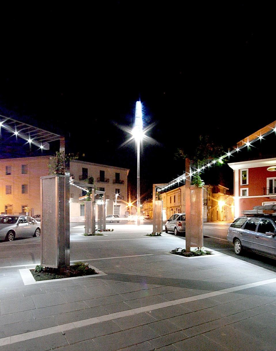 The substantial extension of the junction and the introduction of large areas for town residents to stroll and sit in gave me the inspiration to create paved islands of light. I designed a large street light, twenty metres high, to interact with the gold building: this lights up the edge of the pedestrian platform and marks the centre of the piazza. I designed it to be built in chrome steel and to mimic the shape of a night lamp - its shade is constructed from micro-perforated sheets. The pedestrian platforms form a pavement made up of basalt slabs in different sizes. These are broken up at intervals by thinner bands of travertine, which were intended to embellish the surface with a contrast of colours. The natural green was designed to resemble lime trees, but the shady and strongly design-led character of this urban space is given by long chrome steel "snakes".