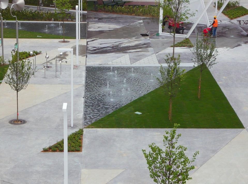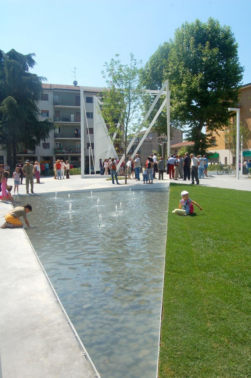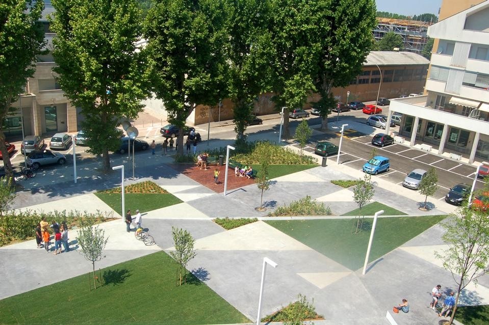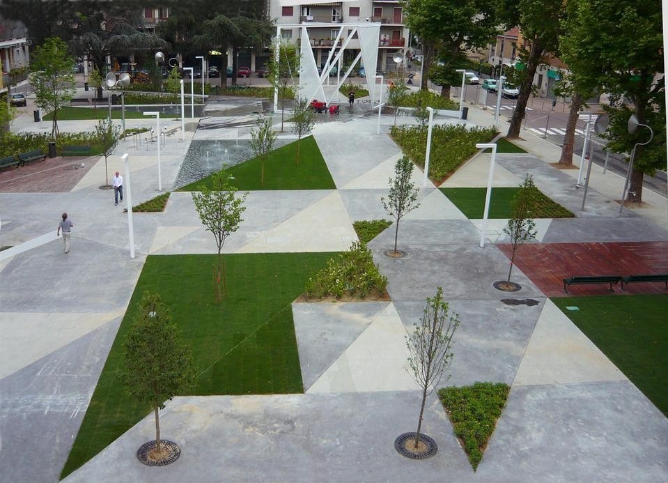 The geometrical layout structuring the piazza is made up of a dense, graded mesh of golden rectangles. The measurements for these have been taken from the site's main dimensions, which determine every element of the piazza, from the basic geometry to the design of the paving sections. Within the piazza, the designers have introduced the unusual idea of creating folds in the ground. This three-dimensional modelling of the ground has two roles: it gives each zone its own spatial character, and it emphasises pre-existing spatial tensions, introducing new ones at the same time.