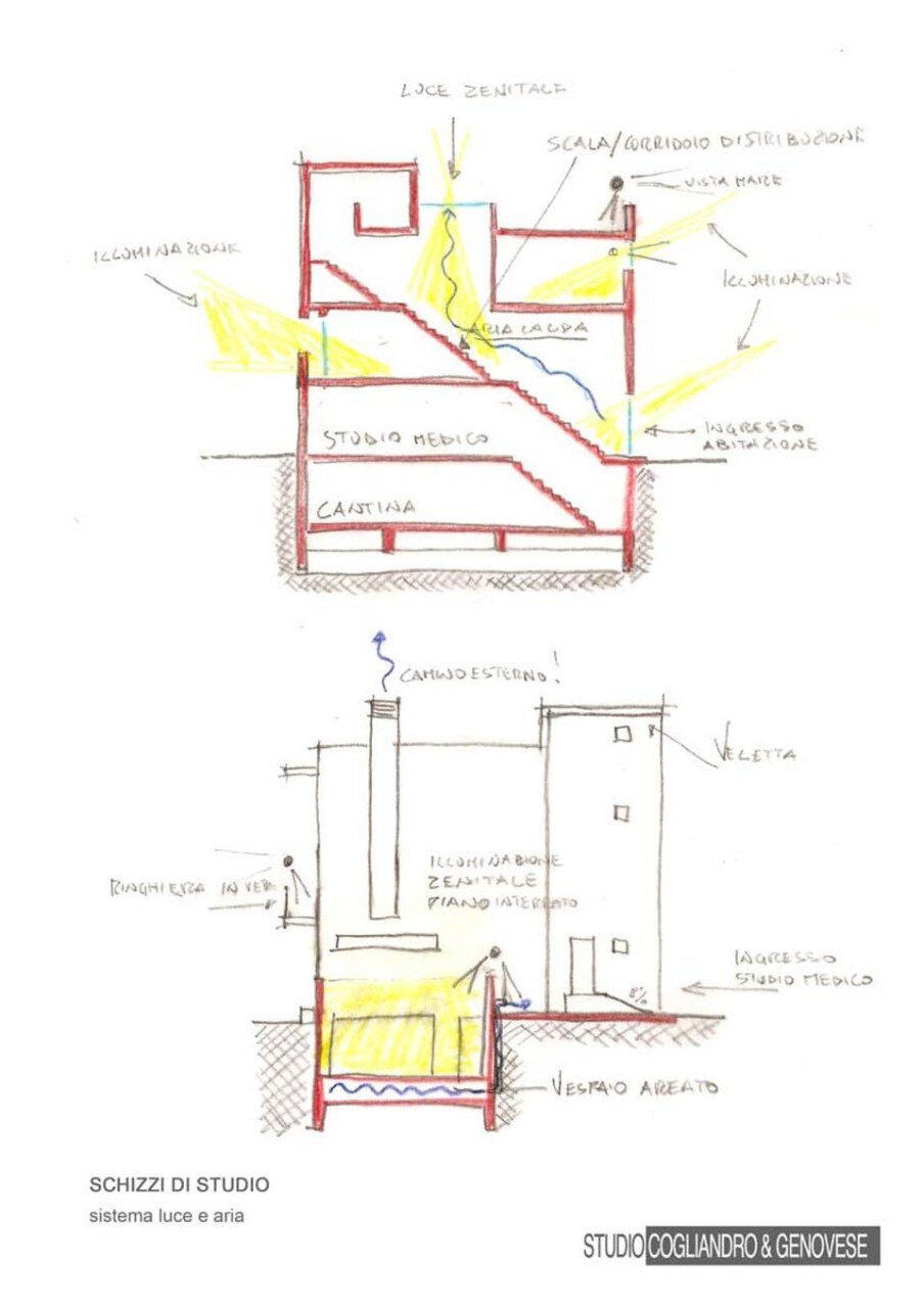 The design of the house is unified by the stairway, which is faced with white marble. As well as allowing access to all parts of the house, it enlarges the internal space by allowing natural light to penetrate from the skylight to the ground floor. Domenico Cogliandro