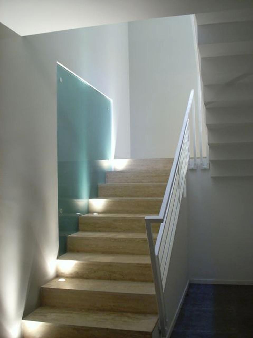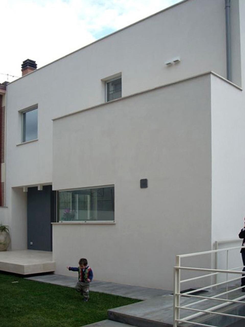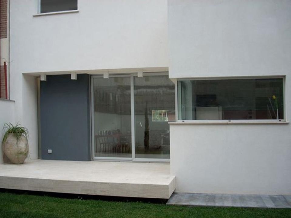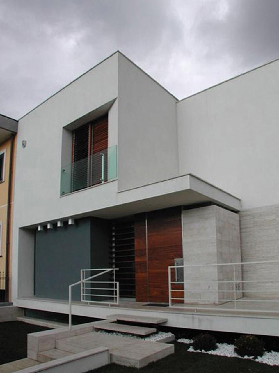 This interconnection is absent on the side facing the street; this is "closed" front designed as a backdrop for the hortus conclusus. The "closure" is indicated by the predominance of filled spaces and by the shielding/puncturing, which allows the surrounding landscape to be glimpsed from inside and means that the exterior does not reveal the organisation of the internal space. The construction and architectural definition has incorporated traditional, local materials; the colour scheme as well is typical of the location. White and dark grey plaster (traditional in the area) has been used for the exterior, and striped, polished travertine for the cladding, as well as for the internal and external flooring in the living areas up to the garden. (Travertine was chosen both because it is durable and similar in colour to Modica stone, which is widely used in the area around Catania.) The paving in direct contact with the ground (outside and in the basement) is made from lava stone, as if to reassert symbolically the tectonics of the area.