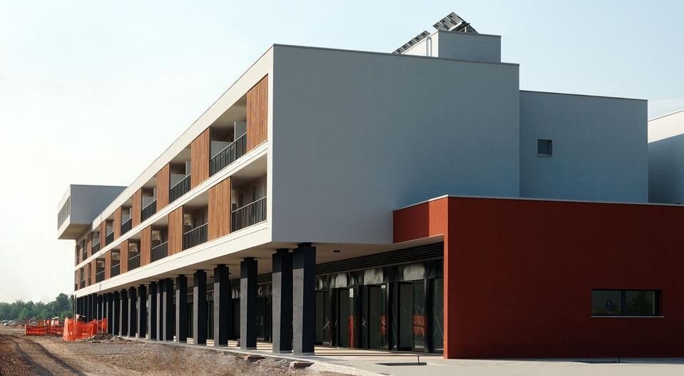 In 2002, the Comune di Brescia, ran a competition/tendering process to allocate a site that was part of the Piano per l’Edilizia Economico Popolare (PEEP 2000), in other words earmarked for building affordable public housing, at San Polo, on the eastern side of the council area and a continuation of the San Polo neighbourhood, designed by Leonardo Benevolo, from 1972 onwards and built in the 1980s and 1990s. In substance, what is known as “Sanpolino” constitutes the latest phase, in chronological terms, of a council housing project instigated by the Comune di Brescia. The competition site, defined by a masterplan drawn up by the Comune, was divided into three sections, with 800 housing units. The participants (building consortiums) were obliged to set up multi-disciplinary design groups for drawing up the preliminary schemes. After the competition phase, between 2004 and 2007, the three sections were realised, each by different contractors and different designers.