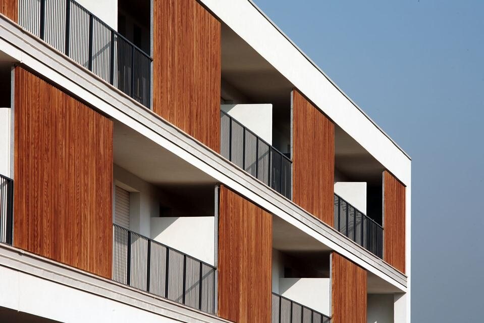 To comply with the brief, for the north-east front facing on the mall a screen was realised made from brise-soleil panels in wood, able to bring a compositional complexity to the main facade. The final result appears as a kind of patchwork on a fixed base (the brise-soleil)