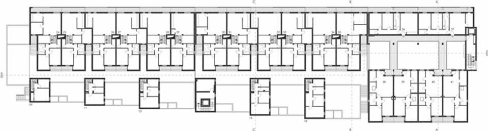 Tipo D: Single-storey two-roomed apartments and two-storey three-roomed apartments that form the fragmented front that faces towards the inside of the site and has the task of forming a dialogue with the small and complex volumetric articulation of the houses on the site.