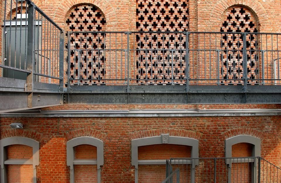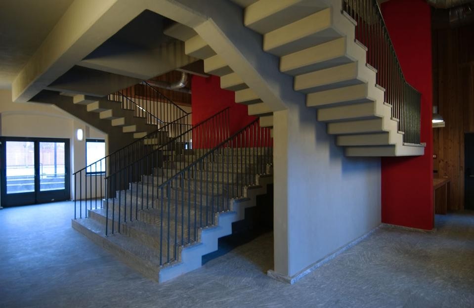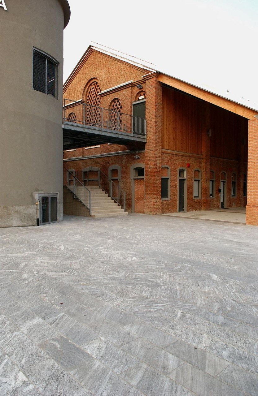 The two silos, now linked together with zinc-plated steel bridges, have been used for a technical area and a fire escape. The covered area outside, where a new garden is being developed, has become the most well used space in this area of the town. Alberto Caruso, Elisabetta Mainardi