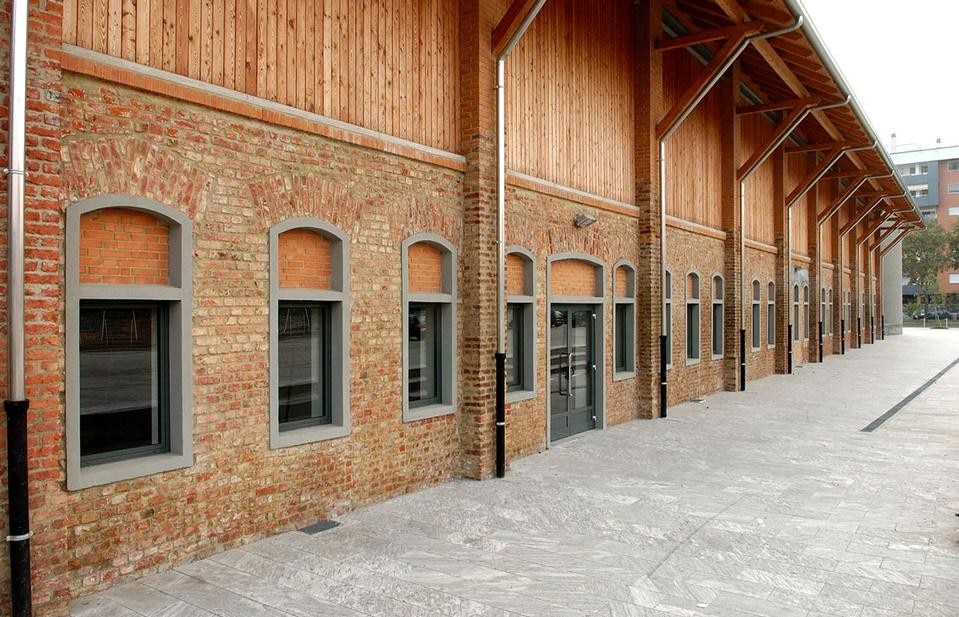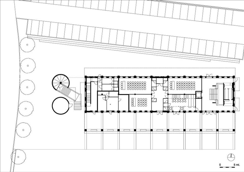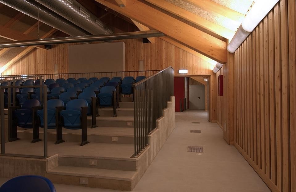 On the first floor, space has been found for a small 400-seat theatre, which has been built entirely from wood: it fills the empty barn arches and is supported by a double wall faced in larch wood planking.