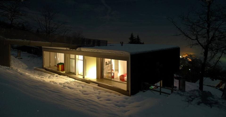 This geometry, which seems to foist itself on the reality, is instead contaminated and its skin adopts a sense of uncertainty and mutability. The external cladding of the building – a synthetic-grass surface – is both abstract and familiar: a man-made invention that transforms the nature of the landscape. Inside, the layout and organisation of the spaces is based on the relationship between the inhabitants and their immediate surroundings, between the house and its terrain.