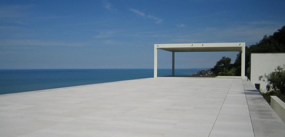 The manor house occupies the lower part of the monolithic block, but the real life of the house is on the roof, a ship's deck, where the long swimming pool is immersed in white stone from which emerges the white, steel loggia, the crow's nest; its lightness is balanced, to the south, by the solid, white cube of the guest-house.