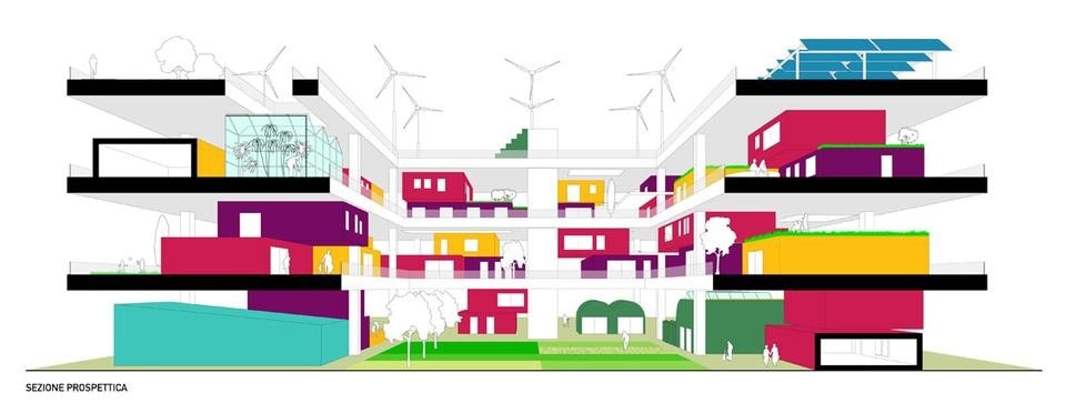 The “Condominio produttivo” offers the opportunity to develop an alternative strategy for the reuse of incomplete structures. Disused industrial buildings and abandoned reinforced-concrete frames that blight the landscape can serve an alternative form of land management, aimed at saving land and prolonging the life-cycle of structures.